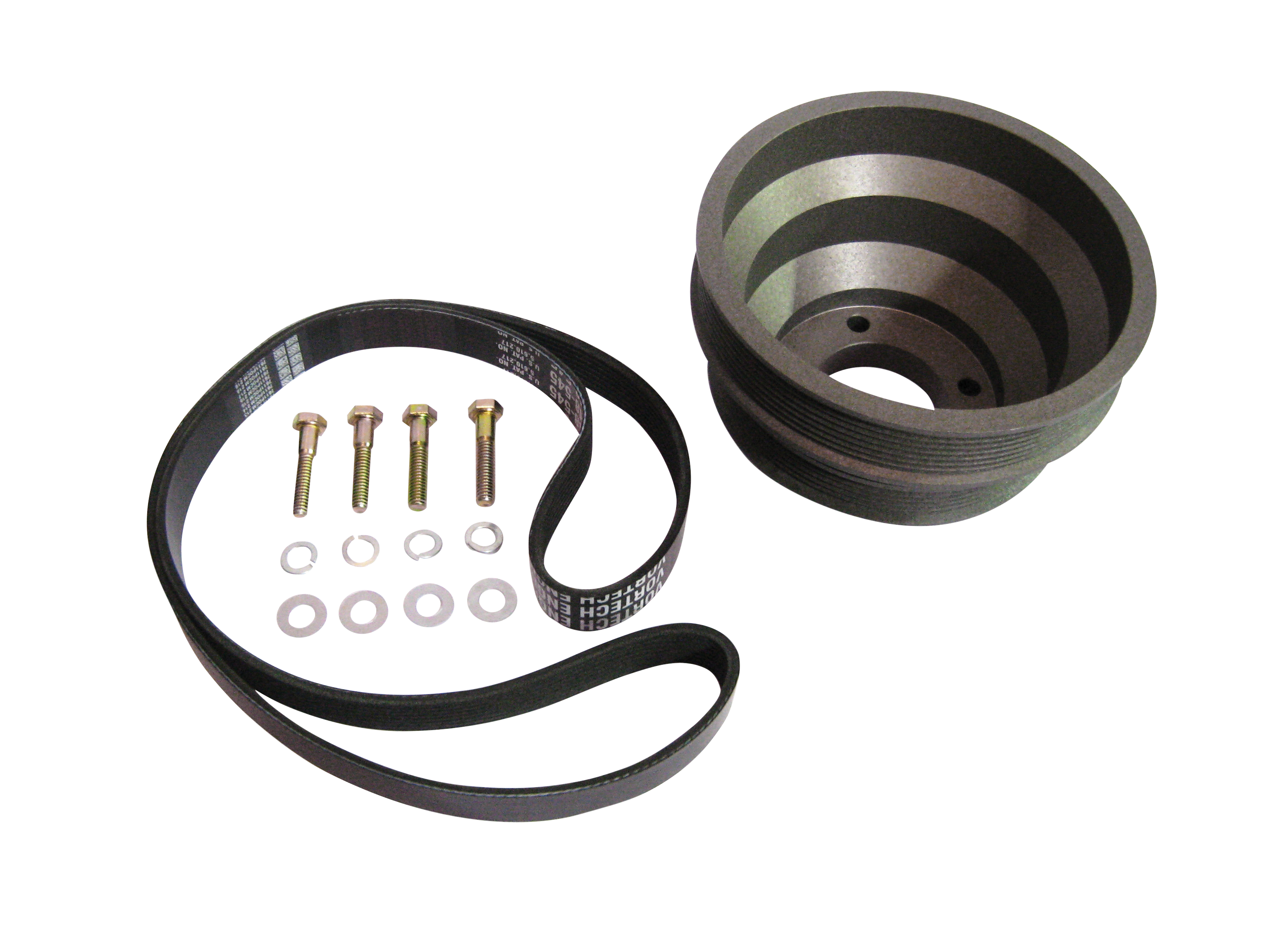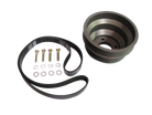Crank pulley assembly for 1986-1993 Ford 5.0 Mustang applications. Includes crank pulley, mounting hardware, and appropriate drive belt for use with 3.33" supercharger pulley. 8-Rib and 10-Rib supercharger drive pulleys feature single crank pulley design that accommodates both accessory and supercharger drive belts, with standard or underdrive 6-Rib accessory drive.