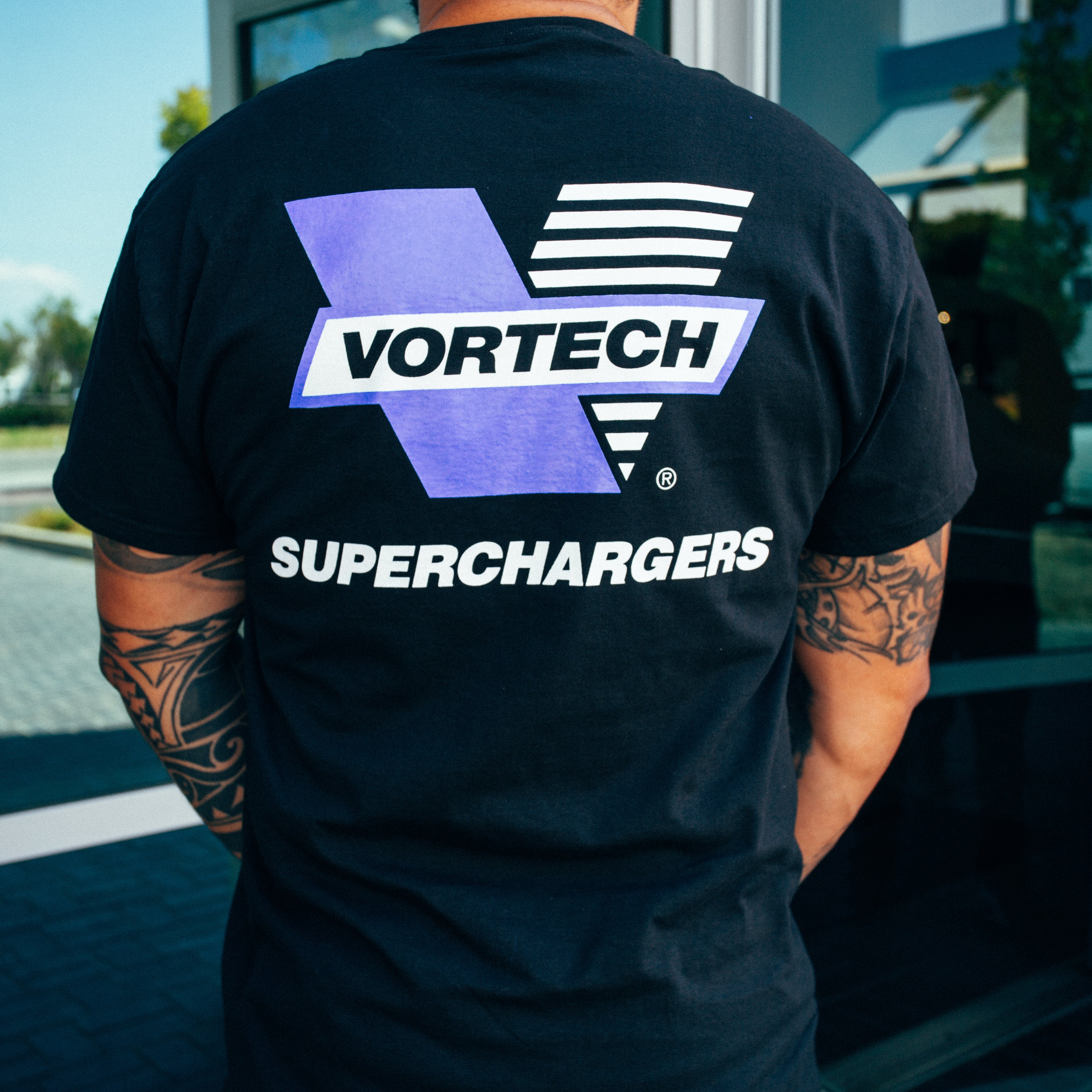 The Iconic Vortech "V" Logo Design T-Shirt, now in full color. Design features Vortech Superchargers "Long Logo" on Front, with Large Full Color Vortech "V" Logo on Back.